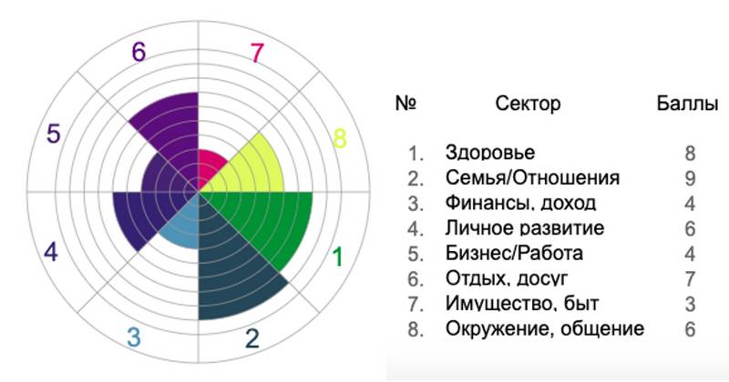 Колесо Жизненного Баланса позволит вам определить, что у вас на самом деле происходит в основных сферах жизни и куда, в первую очередь, нужно прикладывать усилия.