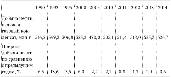 В 2014 г. добыча нефти в России достигла 526,7 млн т – максимального уровня за период с 1990 г. (табл. 1.1, рис. 1.1). В то же время наблюдается заметное снижение темпов ее роста, обусловленное прежде всего объективным ухудшением условий добычи. Значительная часть эксплуатируемых месторождений имеет высокую степень выработанности и вступила в стадию падающей добычи, а новые месторождения в большинстве случаев характеризуются худшими горногеологическими и географическими параметрами, их разработка требует повышенных капитальных, эксплуатационных и транспортных затрат.