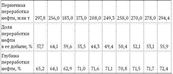 В российской нефтеперерабатывающей промышленности, несмотря на определенные положительные сдвиги, например значительное увеличение доли высокооктанового бензина, коренной модернизации не произошло. Она по-прежнему значительно отстает от развитых стран по технологическому уровню, структуре и качеству производимых нефтепродуктов. Глубина переработки нефти в России составляет лишь 72 %, тогда как в ведущих промышленно развитых странах она достигает 90–95 %. Данный показатель в России в настоящее время близок к уровню начала 2000-х гг. и незначительно превышает дореформенный уровень (в 1990 г. глубина переработки нефти в России составляла 65 %).