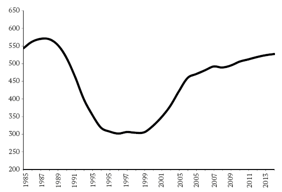 Рис. 1.1. Добыча нефти, включая газовый конденсат, в 1985–2014 гг., млн т