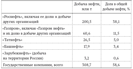 В 2013 г. «Роснефть» благодаря приобретению нефтяной компании «ТНК-ВР», на которую с учетом ее доли в компании «Славнефть» приходилось 15,7 % общероссийской добычи нефти, значительно усилила свои позиции в российском нефтяном секторе и стала одной из крупнейших нефтяных компаний мира. В 2014 г. была возвращена в государственную собственность компания «Башнефть». В результате госсектор существенно расширился, а доля государственных компаний в общероссийской добыче нефти, по нашим расчетам, в 2014 г. достигла 58,6 % (табл. 1.2).