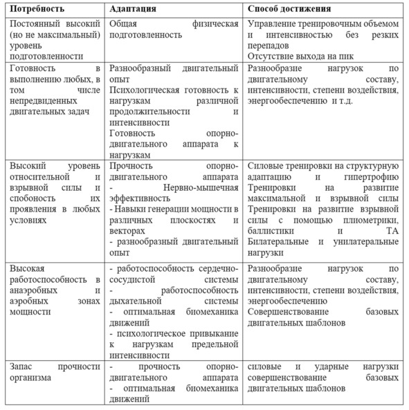 Конечно, нельзя забывать про эффект функционального переноса. Запас абсолютной силы, наработанный тяжелоатлетическими тренировками, позволит любую силовую работу выполнить лучше, чем нетренированный «железом» человек. Но перенос ограничен, и не стоит ждать чудес. В этой связи при построении тренировок необходимо точно понимать, какой адаптации необходимо достигнуть в итоге. А от этих потребностей затем отталкиваться при выборе необходимого стимула. В случае со служащими силовых структур необходимы адаптации, решающие главные потребности. Некоторые из потребностей, связанные с ними адаптации и способы достижения представлены в таблице ниже. Понятно, что конкретные потребности определяются спецификой подразделения и выполняемых сотрудником задач. Важно сохранять при этом ту же логику: «Что мне необходимо? – Какие изменения для этого в организме должны произойти? – Как достигнуть этих изменений?».