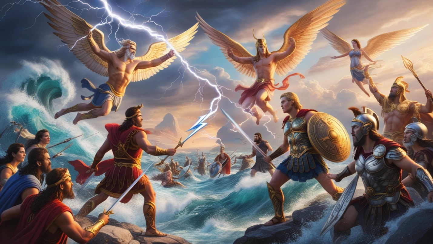 Внезапно небо затянулось черными облаками, и раздался гремящий звук, как будто сама земля стонала от страха. Боги, спустившись с небес, появились на поле боя. Один из них, величественный и светящийся, с мечом в руке, был богом света. Его глаза сверкали, как звезды, и он излучал ауру силы и справедливости. Напротив него стоял бог тьмы, окутанный тенями, с зловещей улыбкой на лице, его присутствие вызывало страх и трепет.