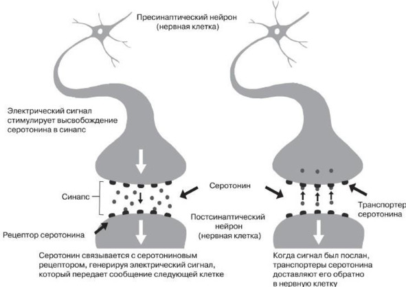 «В момент, когда серотонин находится между нейронами в синапсе, мы чувствуем себя счастливыми»