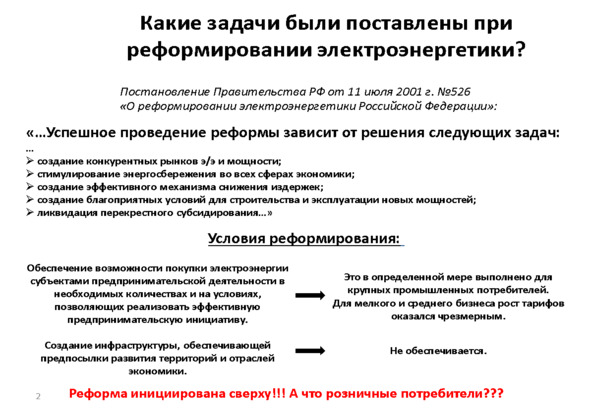 Главными задачами реформирования электроэнергетики России, как заявляли её идеологи, были: