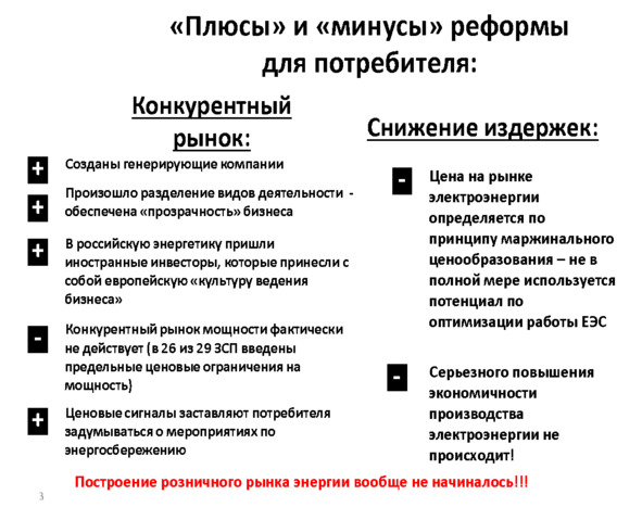 Ничего этого в полной мере в результате не произошло, так как процесс реформирования электроэнергетики России оказались не достаточно продуманными. Вместо конкурентных цен было получено маржинальное ценообразование с одномоментным ростом тарифов в среднем в 1,5—2 раза. Реформаторы обещали снизить тарифы в электроэнергетике и привлечь инвестиции. Ни того ни другого не произошло. Фактически был создан монопольный рынок продавца, а не потребителя, как основа любых конкурентных рыночных отношений. В этой связи необходимо провести тщательный анализ результатов преобразований в отрасли и восстановить контроль Государства в электроэнергетике, от которой зависит энергетическая безопасность страны. Были приняты ряд не обдуманных решений. Ликвидация самой надежной и эффективной системой в мире. Единой Энергетической системы России была проведена без поэтапного анализа проводимых реформ, как это прописано в Постановлении Правительства РФ №526 о реформе в электроэнергетике. В 2001 году во время визита в Региональную энергетическую комиссию штата Калифорния в г. Сакроменто США мне был задан сакраментальный вопрос: «Зачем вы разрушаете лучшую в мире энергосистему?»