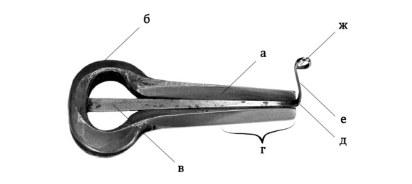 г) рабочая часть дек; д) загиб язычка; е) колено; ж) колечко