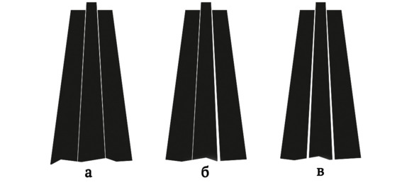 Рис. 3. Зазоры рамы: а) хорошие, узкие зазоры; б) неравномерные зазоры (слева меньше, чем справа); в) неравномерные зазоры по длине, на конце варгана меньше, чем у основания рабочих кромок