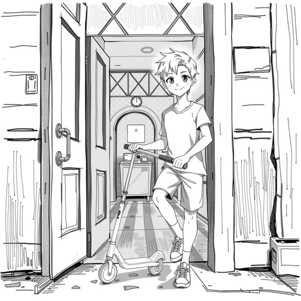 Худенький мальчуган был одет в новую белую футболку, заправленную в серые трикотажные шортики, по современной моде несколько длинноватые, белые носочки и такие же кроссовки. На левой коленке темнела недавно полученная болячка. Честно говоря, я в своей жизни очень редко встречал мальчишек, у которых не были бы ободраны коленки. Этот человечек не был исключением. Наиболее вероятная причина болячки была в руках мальчика – он вышел с самокатом.