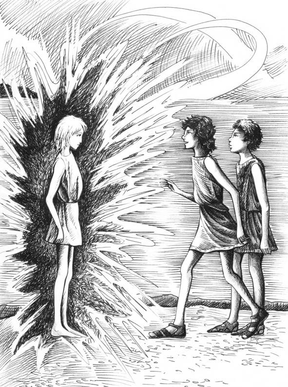 Мальчишка никуда не исчез. Он продолжал стоять в нескольких шагах от ребят. Только теперь перед ними стоял мальчишка в красивой зелёной тунике, украшенной золотым орнаментом. Он сделал два шага вперёд, вышел из воды и только тут заметил во что одет. Ахнул, ощупывая и осматривая себя, потом взглянул на стоящих в молчании ребят: