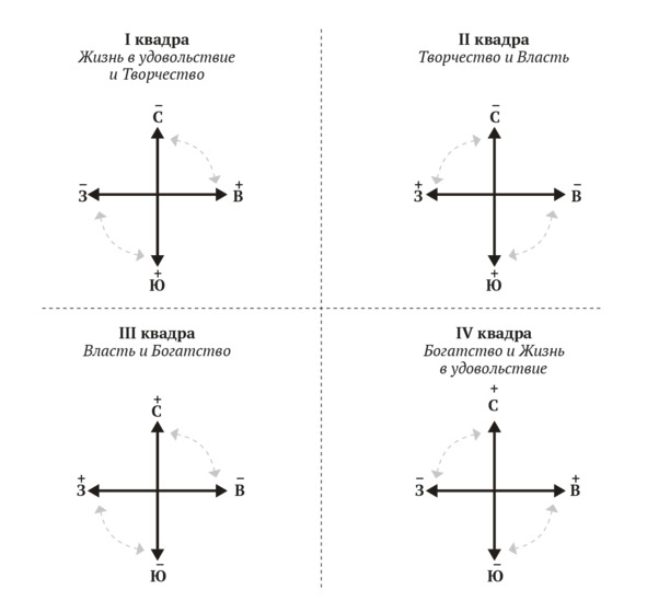 В первую квадру входят четыре типа, которые друг с другом образуют две шкалы: удовольствия от жизни и творчества. Это типы ВС, ЗЮ, ЮЗ и СВ. Шкала удовольствия от жизни, или витальная шкала, или шкала счастья и свободы, замыкается между З сильных 1или 2 модулей одного типа и В в сильных 1 или 2 модулях другого типа. А шкала творчества замыкается аналогичным образом между С и Ю в сильных 1 или 2 модулях. + — — + + — — + — В В + В В — + В В