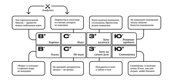 Эту идею улавливает ЗЮ и перекладывает её на понятный для всех язык, добавляя метафоры и подкрепляя её примерами из жизни. Более того, ЗЮ создаёт все условия для ВС, чтобы данная идея развивалась и додумывалась. ЗЮ – это своеобразный Санчо Панса для Дон Кихота, представителя типа ВС. — + — + + — — + + —