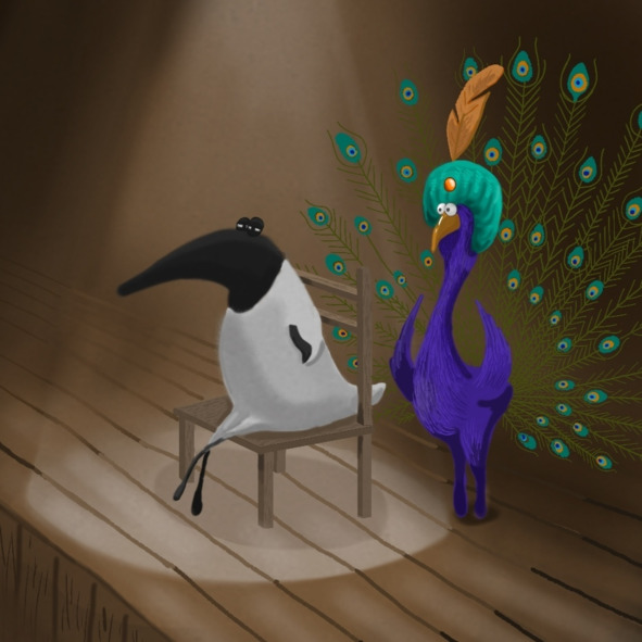 Зрители покатились от хохота. Все птицы держались за свои животики и смеялись. Улыбался и сам павлин. Невозмутимыми оставались лишь птицы, сидевшие на сцене. С закрытыми глазами они пребывали в гипнотическом сне.