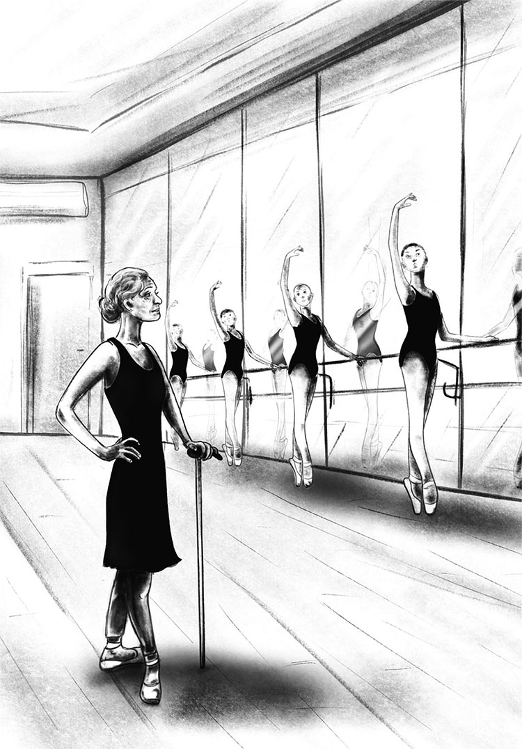 Занятия проходят у огромного, во всю стену зеркала, около которого ряд учениц, одинаково одетых и держащихся за горизонтально установленную палку, делают одни и те же движения. Командует этим действом Аделаида Сафронова, внимательнейшим образом следящая за каждой девочкой. Её взор непреклонен, она отбивает ритм тоненькой тросточкой и шуршащим голосом подаёт чёткие команды: