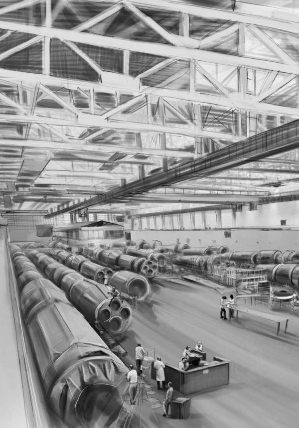 Вячеслав прошёл по участку формообразования и сварки секций тех самых топливных баков. Из толстых сверкающих металлических листов огромных размеров специальный станок делал полуцилиндры. Это были заготовки для топливных баков из специального сплава. Компоненты ракетного топлива подразумевали применение жидкого кислорода и жидкого водорода, температуры которых приблизительно минус двести градусов Цельсия, поэтому сплав, из которого изготавливался бак, должен быть устойчивым к этой температуре и не становиться хрупким, должен выдерживать огромные перепады температур внутри и снаружи, должен хорошо свариваться, должен быть лёгким и ещё много чего должен по своим характеристикам, понятным только специалистам.