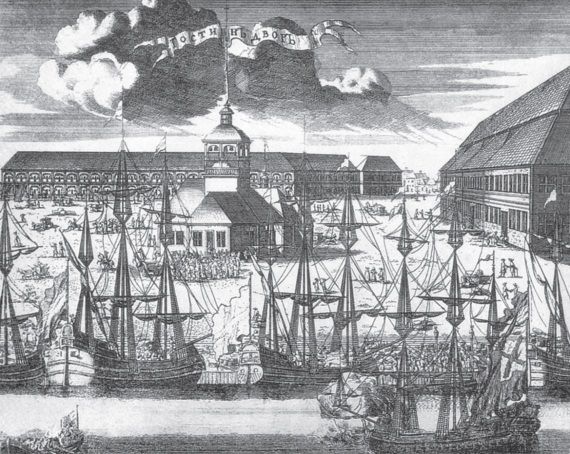 Гостиный двор. Клеймо гравюры А.Ф. Зубова «Панорама Петербурга». 1716 год