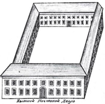 Построенный наскоро, без всяких архитектурных затей и начавший действовать в начале 1714 года Почтовый двор был обширным, двухэтажным, почти квадратным в плане, мазанковым зданием с большим внутренним двором и с наружными, обращенными на все стороны деревянными «галереями для удобности, чтоб приезжие стоять могли» – как писал один из иностранцев, посещавших в те годы Петербург.
