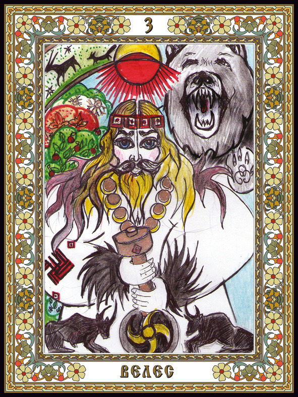 Велес, или Волос, – архаическое божество «скотий бог», бог плодовитости, скотоводства, богатства. Слово «скот» вплоть до Средневековья означало не только домашних животных, но и имущество, деньги, богатство. Скот олицетворял богатство племени, и именно ту его часть, которая, в отличие от зерна, могла почти неограниченно накапливаться и обмениваться. В глубокую древность уводит загадочная связь Велеса с медведем. В охотничьем неолитическом обществе Велес был хозяином леса, выступавшим в медвежьем обличье. Также отмечена его связь с миром предков. Если медведь более архаичная охотничья ипостась Велеса, то бык, или тур, поздняя скотоводческая, встречаемая в южных славянских областях от Украины до Далмации. «Скотий бог» занимает видное место в народной календарной обрядности. Связь Велеса с зимними святками объясняет не только обрядовое печенье в виде домашних животных, но и ряженье, одевание звериных масок в святочные дни, пляски в вывороченных тулупах.