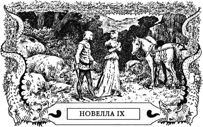 Как услышал это Бернабо, ему почудилось, точно его ударили ножом в сердце, такую печаль он ощутил; совсем изменившись в лице, если бы он и не произнес ни слова, он тем ясно показал, что сообщенное Амброджиоло справедливо, и по некотором времени сказал: «Господа, то, что говорит Амброджиоло, справедливо; потому, так как он выиграл, пусть и придет, когда угодно, и ему будет заплачено». Так на следующий день он сполна заплатил Амброджиоло. Выехав на другой день из Парижа, Бернабо отправился в Геную, ожесточенный духом против жены. Приближаясь к городу, он не пожелал вступить в него, а остался в двадцати милях в одном своем поместье; одного из своих слуг, которому очень доверял, послал с двумя конями и письмом в Геную, написав жене, что он вернулся и чтобы она прибыла к нему со слугою, а ему тайно приказал, что, когда он с женою будет в местности, которая покажется ему удобной, он без всякого милосердия убил бы ее и вернулся бы к нему. Когда слуга прибыл в Геную, отдал письмо и исполнил поручение, жена приняла его с большой радостью и на другое утро, сев со слугою на коней, поехала по дороге к своему поместью. Путешествуя вместе и рассуждая о разных вещах, они прибыли в лощину, очень глубокую, уединенную, окруженную высокими скалами и деревьями; так как слуге это место показалось таким, что он может, безопасно для себя, исполнить приказание своего хозяина, он вытащил нож и, схватив даму за руку, сказал: «Мадонна, поручите душу Богу, ибо вам придется, не ходя дальше, умереть». Увидев нож и услышав эти слова, дама, совсем испуганная, сказала: «Помилосердствуй, ради Бога, и скажи, прежде чем убить меня, чем я тебя оскорбила, что ты должен убить меня?» – «Мадонна, – ответил слуга, – меня вы ничем не оскорбили, а чем вы оскорбили вашего мужа, о том я знаю лишь потому, что он велел мне, безо всякого милосердия к вам, убить вас на этом пути; если бы я того не сделал, он обещался повесить меня. Вы знаете, насколько я ему обязан и могу ли я сказать да или нет в возложенном им на меня деле. Господь ведает, мне жаль вас, а иначе поступить я не могу». Дама, в слезах, сказала: «Смилуйся, ради Бога, не пожелай сделаться, услуживая другому, убийцей человека, никогда тебя не оскорбившего. Господь, все ведающий, знает, что я никогда не совершала ничего, за что должна была бы получить от моего мужа подобное воздаяние. Но оставим пока это, ты можешь, коли пожелаешь, заодно угодить Богу и своему хозяину и мне – таким образом: возьми это мое платье, дай мне только твой камзол и плащ, с ними вернись к моему и твоему господину и скажи, что ты убил меня; а я клянусь тебе жизнью, которую ты мне даруешь, что я удалюсь и уйду в такие места, что ни до тебя, ни до него, ни в эти страны никогда не дойдут обо мне вести». Слуга, неохотно снаряжавшийся убить ее, легко поддался чувству сострадания; потому, взяв ее платья и отдав ей дрянной камзол и плащ и оставив при ней несколько денег, какие были, он попросил ее удалиться из этих мест и оставил ее пешею в лощине, а сам отправился к своему хозяину, которому сказал, что не только исполнил его поручение, но и покинул ее мертвое тело среди стаи волков.