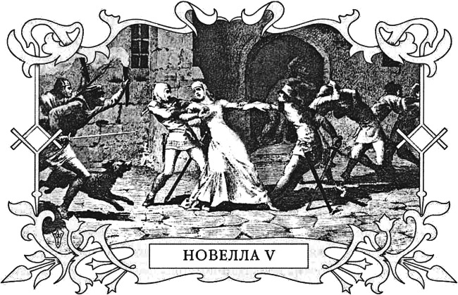 Когда Кривелло увидел, что настал час, условленный с Джьянноле, сказал сам себе: «Что мне до нее! Коли не будет держаться спокойно, ей же достанется», и, сделав условленный знак, он отворил дверь. Джьянноле тотчас же явился с двумя товарищами, вошел в дом и, найдя девушку в зале, схватил ее, чтобы увести. Девушка стала сопротивляться и громко кричать, и с ней и служанка. Как услыхал это Мингино, тотчас же прибежал со своими товарищами; увидев, что девушку уже вытаскивают из дверей, все они выхватили мечи при криках: «Смерть вам, предатели! Этому не бывать! Что это за насилие!» Так сказав, они принялись рубить. С другой стороны, соседи, выбежав на крик со светочами и оружием, начали порицать это дело и помогать Мингино, вследствие чего после долгой борьбы Мингино отнял девушку у Джьянноле и вернул в дом Джьякомино. Не прежде прекратилась распря, как явились служилые люди начальника города и многих из них перехватали; между прочим, взяли Мингино, Джьянноле и Кривелло и повели их в тюрьму.