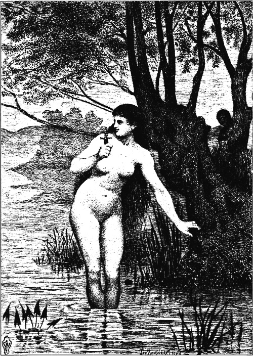 Обрадованный тем, что его замысел, казалось, исполнится, школяр сделал образок с каракулями на нем и написал какую-то небылицу в виде заговора и, выбрав время, послал их даме, велев ей сказать, чтобы в следующую ночь она, не откладывая, сделала то, что он приказал, а затем потихоньку отправился вместе со своим слугою в дом одного своего приятеля, жившего очень недалеко от башенки, с целью привести в исполнение свою затею. С другой стороны, дама пустилась в путь со своей служанкой, направляясь в свое поместье; когда настала ночь, она притворилась, будто идет в постель, а служанку послала спать; в час первого сна она тихо вышла из дома и отправилась к башенке на берегу Арно; долго осмотревшись кругом и не видя и не слыша никого, она разделась, спрятала свое платье под кустом, семь раз окунулась с образком в руках и затем, держа образ, голая пошла к башне. Школяр, который под вечер притаился со своим слугою возле башни среди ив и других деревьев и все это видел, разглядев ее, проходившую мимо, голую, побеждавшую мрак ночи белизной своего тела, а затем рассмотрев ее грудь и другие части тела и убедившись в их красоте, задумался над тем, во что они в скором времени обратятся, и ощутил к ней некую жалость; с другой стороны, вожделение овладело им внезапно и побуждало выйти из засады, пойти схватить ее и учинить с ней желаемое; и он был поочередно увлекаем то одним, то другим. Но когда ему вспомнилось, кто он и какую обиду он получил и зачем и от кого, его негодование снова возгорелось, и, отогнав от себя жалость и плотское желание, он утвердился в своем намерении и дал ей уйти.