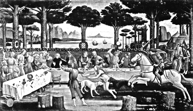 Фьямметта «Декамерона» получает значение лишь на почве биографии поэта, в отношении к его представителям: Дионео, Филострато, Памфило. Первого она видимо балует, снисходит к его повесничанъю и поет с ним о мессере Гвильельмо и о даме дель Верджьу, песню о трагической любви, навеянную хорошенькой французской поэмой о «Chatelaine de Vergi»; либо об Арчите и Палемоне. Печальный Филострасто вызывает ее первую на грустную новеллу о Гисмонде; он же венчает ее на царство, ибо она вознаградит общество за горестные впечатления возбужденных им рассказов, – и она велит рассказывать о любви, полной препятствий, но увенчанной счастьем, и первому на очереди бесед быть – Памфило. Все эти сочетания показались бы нам случайными, если бы биография и сочинения Боккаччо не вносили в них живой смысл. В той и в других находят себе объяснения и некоторые другие подробности: как в «Филоколо» Фьямметта решала, что из двух женщин, одинаково нравящихся мужчине, следует предпочесть ту, которая выше его по роду и состоянию45, так и в «Декамероне» большим благоразумием является в мужчине «всегда искать любви женщины более родовитой, чем он»46. Рассказывая потешную новеллу о Каландрино, Фьямметта откровенно входит в интересы общества, собравшегося с тем, чтоб веселиться, и вместе с тем она любит пораздуматься и поразобраться в вопросах, но в меру. Прекрасные дамы, – говорит она, приступая к одному рассказу, – я всегда была того мнения, что в таких обществах, как наше, следует рассказывать пространно, дабы излишняя краткость не подавала другим повода к спорам о значении рассказанного. Это дело более приличное в школах, среди учащихся, чем между нами, которых едва хватает на прядку и веретено». Мы встретили ту же точку зрения в «Филоколо», где Фьямметта обещает вершать любовные вопросы легко, не углубляясь в их суть и прося избегать тонкостей, потому что, утруждая ум, они не приносят удовольствия.