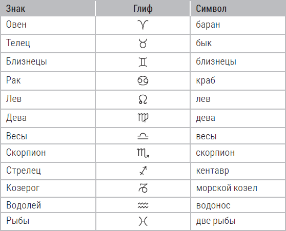 В астрологии для обозначения знаков зодиака (и других данных) с целью удобства используются символы, так называемые глифы. Хотите верьте, хотите нет, но пользоваться глифами гораздо проще, чем писать названия.