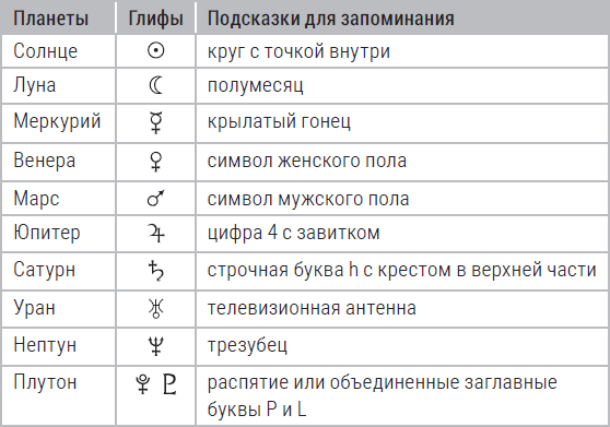 В приведенной ниже таблице показаны глифы, используемые в натальной карте для обозначения планет. Изучите их. Попробуйте изобразить эти глифы, а затем проверьте, сможете ли назвать планеты, которые они обозначают. Затем напишите названия планет и попробуйте нарисовать обозначающие их глифы. Для лучшего запоминания я включила в таблицу подсказки.