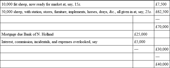 Up to this period of the enterprise John Redgrave, in despite of the episodes of the wool-shed and the flood, had suffered from no anxiety as to the ultimate success of the great venture. The prices of wool and sheep, store, fat, ewes and lambs, culls – everything that could be counted and could run out of a yard – had been firm and adamantine, as the bullion in the vaults of the Bank of England. Every sort, kind, and condition of sheep was worth half-a-sovereign, two to a pound, minimum; one pound a head with station; without, ten shillings.
