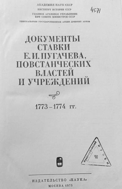 О чём говорит издание? Для начала – о грубых ошибках. Документы Ставки Е. И. Пугачёва, повстанческих властей и учреждений. Какая такая Ставка Пугачёва, если это не самоназвание: у Пугачёва не было Ставки и они не считали себя повстанцами. Это отражено в текстах этого же издания. Хорошо, если Ставка, – тогда это чисто военное мероприятие, а не какое не стихийное восстание.