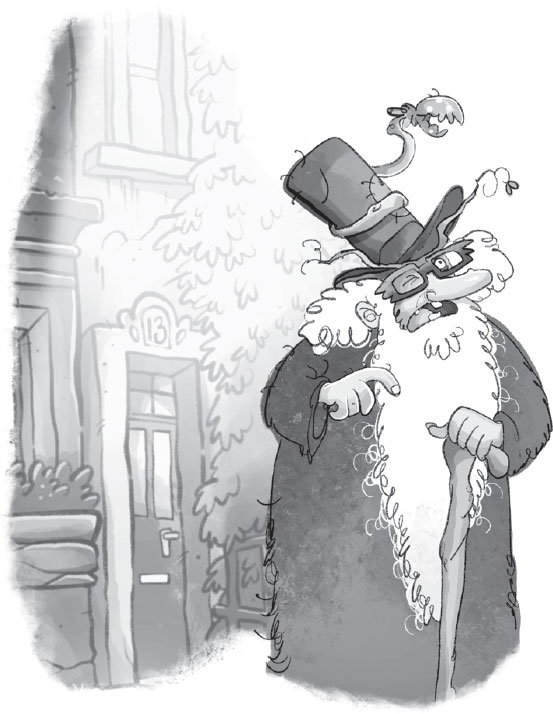 В тот же момент дедушка Страхман впервые выглянул за дверь при свете дня. Это был старик с длинной белой бородой, в тёмно-зелёном пальто и цилиндре, из которого торчало диковинное растение. Он вышел, опираясь на суковатую палку, огляделся по сторонам и, сощурившись, посмотрел на солнце.