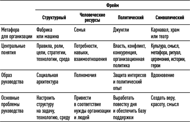 Сортировка конкурирующих голосов является одной из целей этой книги. Мы не занимаемся выискиванием единственного наилучшего пути. Наша задача – сгруппировать основные школы науки об организациях и сформировать всеобъемлющую структуру, охватывающую четыре направления. Нашей целью является пригодное к употреблению знание. Мы разыскивали идеи, достаточно сильные, чтобы ухватить тонкость и сложность жизни организаций, и все же достаточно простые, чтобы быть полезными. Мы многое позаимствовали из общественных наук, особенно из социологии, психологии, политологии и антропологии. Тысячи руководителей и множество организаций также были нашими наставниками. Они помогли нам тщательно просеять исследования общественных наук, чтобы определить идеи, работающие на практике. Мы сгруппировали представления, почерпнутые как из исследований, так и из практической деятельности, в четыре основных фрейма – структурный, кадровый, политический и символический (Bolman and Deal, 1984). Они в равной мере используются учеными и практиками и описаны в литературе, которую можно найти в библиотеках и на полках книжных магазинов.