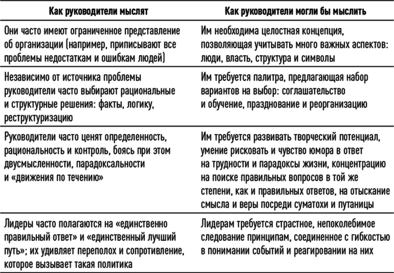 Каждый из фреймов является одновременно действенным и последовательным. Взятые вместе, они делают возможным рефрейминг, рассмотрение одного и того же явления через разные линзы, или с разных точек зрения. Когда мир кажется безнадежно запутанным и ничего не работает, рефрейминг – это могучий инструмент для обретения ясности, восстановления баланса, генерирования новых вариантов и отыскания работоспособных стратегий.