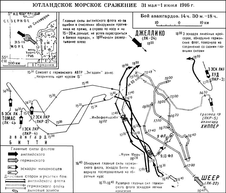 А что немцы? Германский главнокомандующий тоже до сих пор не имел никаких сведений о противнике, он спокойно продолжал двигаться к берегам Норвегии. Линейные крейсера Хиппера находились в 60 милях впереди линкоров Шеера. Ни Битти, ни Хиппер не подозревали, что в 14.00 их эскадры разделяли всего 50 миль. Когда Битти повернул на север на соединение с Джеллико, он оказался на параллельном курсе с Хиппером, а их завесы теперь находились на расстоянии всего 22 мили. Противники могли двигаться так достаточно долго, ничего не подозревая, но вмешался Господин Случай.