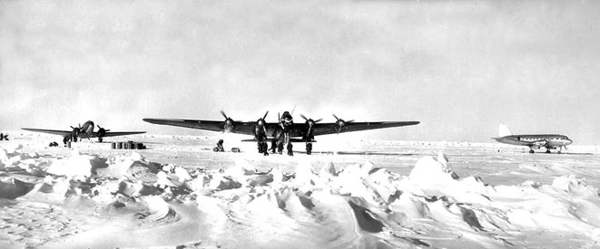 На ледовом аэродроме (слева направо): военно-транспортный самолёт Ли-2, «бензовоз» Пе-8 и пассажирский Ил-12