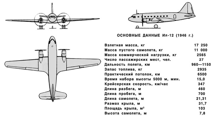 Сх. 1. Самолёт для авиалиний малой и средней протяжённости Ил-12 начал регулярные полёты летом 1947 г. Строился в четырёх основных модификациях. Ил-12Т широко применялся в Полярной авиации. В левом борту его фюзеляжа была расположена двустворчатая дверь. В Аэрофлоте летал до конца 1970‑х гг.