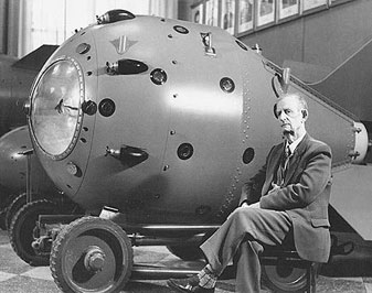 Первая советская атомная бомба РДС-1 и её создатель академик Ю. Б. Харитон. Примечательно, что аббревиатуру «РДС» неофициально расшифровывали как «Россия делает сама»