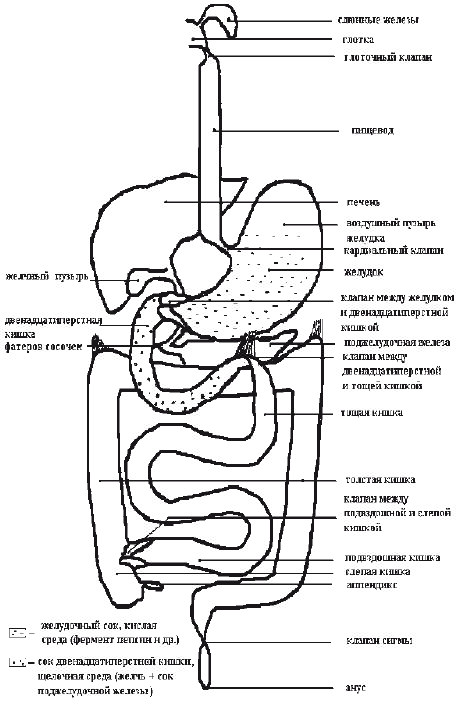 ЖКТ начинается с ротовой полости (рис. 1), откуда пища попадает в пищевод и затем в желудок. В желудке она обрабатывается ферментом пепсином и соляной кислотой, в результате чего белки животного происхождения расщепляются на аминокислоты.