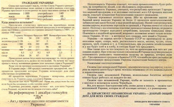 В Украине, кроме референдума о сохранении Союза (70% украинцев проголосовало «За!»), ссылаясь на Декларацию о независимости Украины, был проведен еще и республиканский консультативный опрос. 84% людей, голосовавших строкой выше за Союз, высказались за независимость Украины. На лицо, – манипулирование сознанием масс (по факту – раздваивали личности избирателей, вкладывая им мысли: «…скинем нахлебников из других республик и заживем, как во Франции»….. Изменения формулировки вопроса, вносило разночтение в понятие «сохранение Союза».