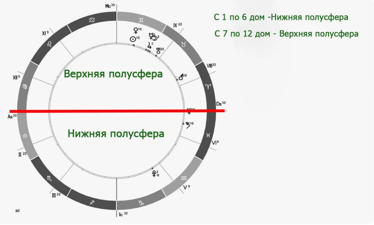 Разделите карту по оси MC (зенит) – IC (надир). Планеты выше горизонта (от ASC к MC и DSC к MC) —Верхняя полусфера. Ниже —Нижняя.
