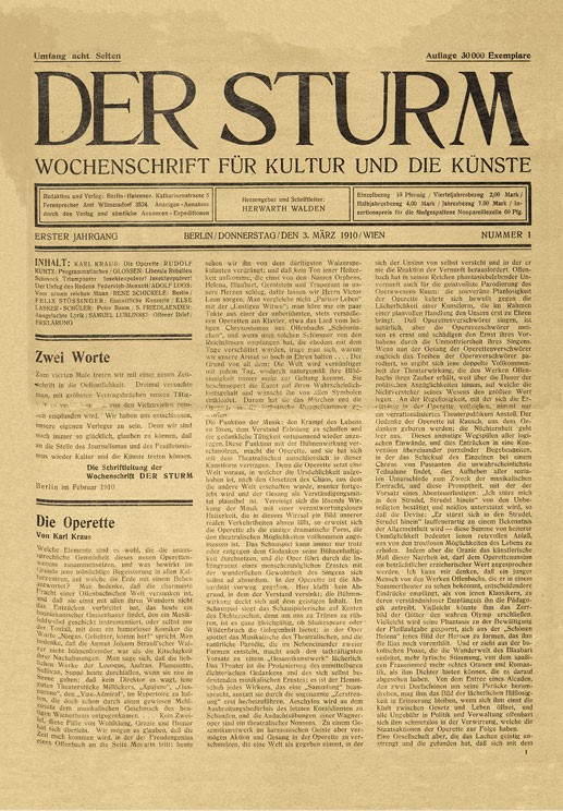 Первый номер журнала, вышедший 3 марта 1910 года, имел газетный формат и был напечатан на газетной бумаге. Но при этом «Штурм» выглядел весьма стильно благодаря графическому образу, который придумал для него австрийский художник Оскар Кокошка (в дальнейшем это обстоятельство поможет Вальдену проложить путь в мир изобразительного искусства).