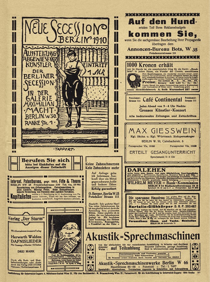 Нельзя не признать, однако, что быстрое развитие «Штурма» все же происходило благодаря энергии самого Вальдена, который делал все, к чему прикасался, по воспоминаниям знавших его, «с обворожительной страстью и непреклонным упорством»[30]. Всего через пару месяцев после выхода в свет первого номера журнал имел уже 4000 подписчиков и печатал четыре страницы рекламы, что давало шанс продолжить дело. Об этом не без некоторого удивления и гордости Вальден сообщает в письме Краусу в июне 1910 года[31].