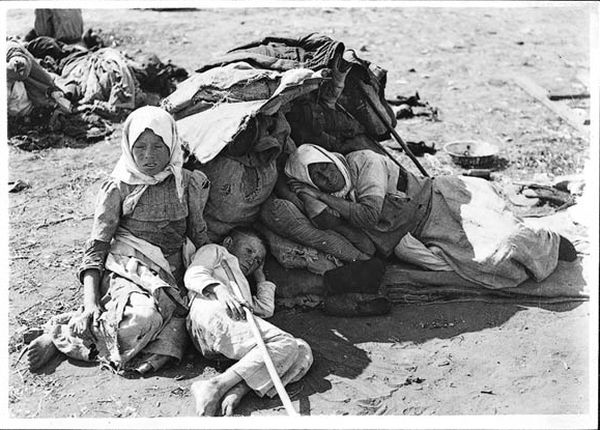 Женщина с детьми в ожидании транспорта, чтобы уехать из голодающих районов