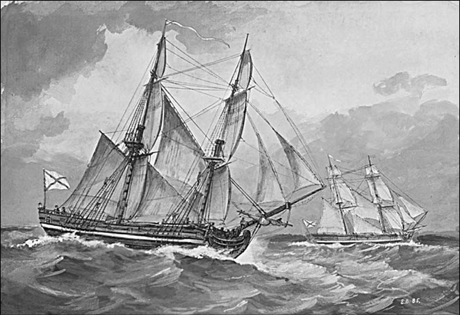 Витус Беринг и Алексей Чириков ведут пакетботы «Святой Петр» и «Святой Павел» к берегам Америки
