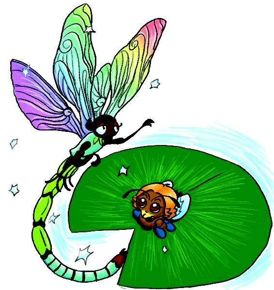 „Gibt es in diesem Gewässer viele Frösche?“ fragte sie den Brummer und setzte sich genau in die Mitte des Blattes, damit man sie vom Wasser aus nicht erblickte.