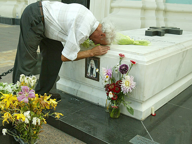 Выйдя на площадь Богдана Хмельницкого Андрей обратил внимание на могилу, находящуюся прямо у входа в Софийский заповедник, в которой был похоронен первый предстоятель Украинской Православной церкви Киевского Патриархата Владимир (Романюк). Тогда в далеком уже 1995-м возле храма произошла массовая драка между участниками похоронной процессии и милицией. Причиной столкновения стало намерение УПЦ КП похоронить патриарха не на Байковом кладбище, как решило правительство Украины, а на территории заповедника «София Киевская». В итоге патриарха Владимира похоронили прямо у главного входа в Святыню Киевскую. Сегодня была очередная дата смерти священнослужителя. В отличие от предыдущих лет вспомнить о покойном патриархе собрались всего около 25 человек. Они развернули несколько флагов Конгресса Украинских Националистов и выцветший национальный «жовто-блакитний» флаг.