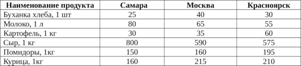 ‼ В задаче приведены реальные цены на продукты. Но стоимость продуктовой корзины из отдельных групп товаров никак не характеризует уровень жизни в указанных городах в целом.
