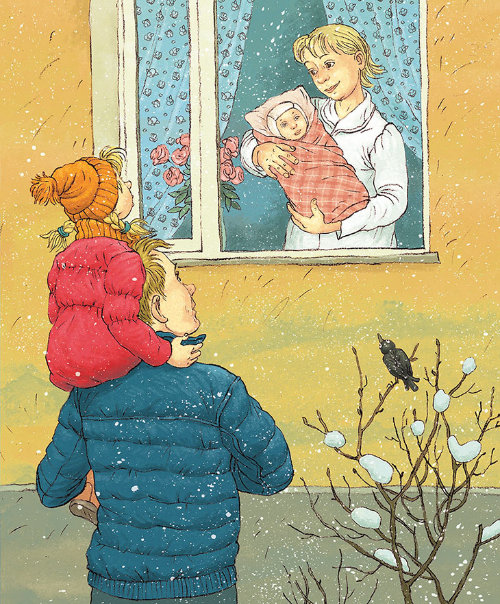 Тут принесли маленьких, и мама показала мне сестрёнку. Через окно было трудно её разглядеть, поэтому папа посадил меня к себе на плечо. Я увидела, что сестрёнка хорошенькая и глазки у неё закрываются, как у куклы. Наверное, родители правы: ради такого замечательного ребёнка можно без сожаления избавиться от неудавшегося первого. Я даже немного перестала обижаться, потому что мне стало как-то гордо за свою сестрёнку, ведь она такая красивая, как настоящий мотылёк в коконе.