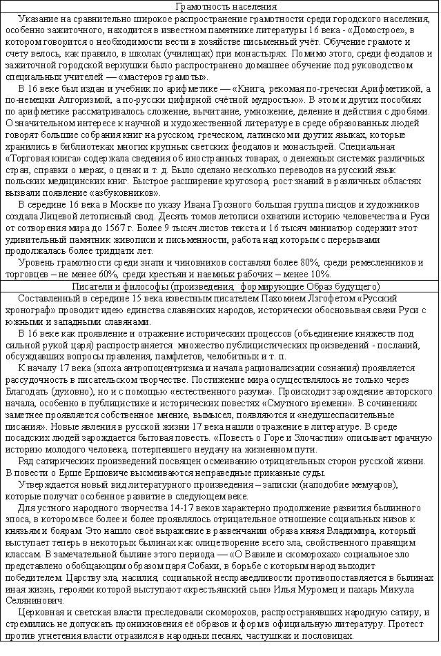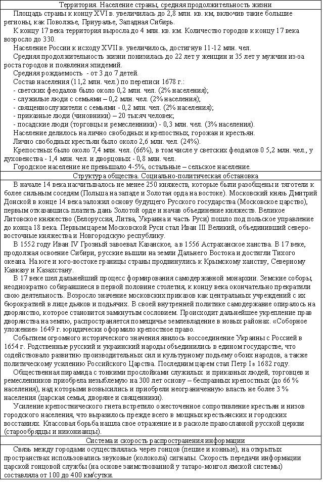 В 15 веке, с началом объединения мелких княжеств в Великое Московское Княжество, закладываются основы крепостничества – князь, а затем и царь, начинает раздавать участки земли своим дворянам вместе со свободными людьми, их населяющими и эти люди становятся крестьянами, обязанными подчиняться новому барину и отдавать ему долю своих доходов. И если поначалу крестьянин с семьей мог перейти на другие земли выплатив барину ежегодную долю, то после отмены «Юрьева дня» в 1592 году и ввода Соборного уложения 1649 года он вместе с семьей становится бесправным холопом – крепостным рабом, с которым барин может делать что угодно. Князья и цари теперь не интересовались жизнью своих подданных, они были озабочены укреплением своей власти и пресечением боярской крамолы, подавлением крестьянских бунтов и отражением нападений соседних государств – Швеция с севера, Польша с запада, Крымское ханство и Турция с юга. Церковь, пользуясь поддержкой власти, усилила гонения на тех, кто выражал общественные настроения и распространял народную культуру, не боялся высмеять неприглядные поступки бояр или священников, создавал песни и поговорки – скоморохов, наследников древних боянов. В 1648 году церковники добились полного запрета скоморошества как профессионального занятия, власти уничтожали их поселения и музыкальные инструменты, наказывали и слушателей. Так укреплялся ещё один барьер, разделяющий общество и укрепляющий власть – страх большинства за свою жизнь и жизнь своих близких, которыми теперь распоряжалась меньшинство. Краткая информация по периоду представлена в следующей таблице.