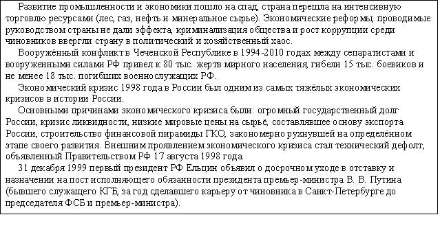 Но Россия ещё имеет огромный потенциал (научный, технический и культурный), который может быть использован в ближайшие десятилетия, если в обществе произойдут изменения и главной целью государства (власти) станет именно человек, как основа общества.